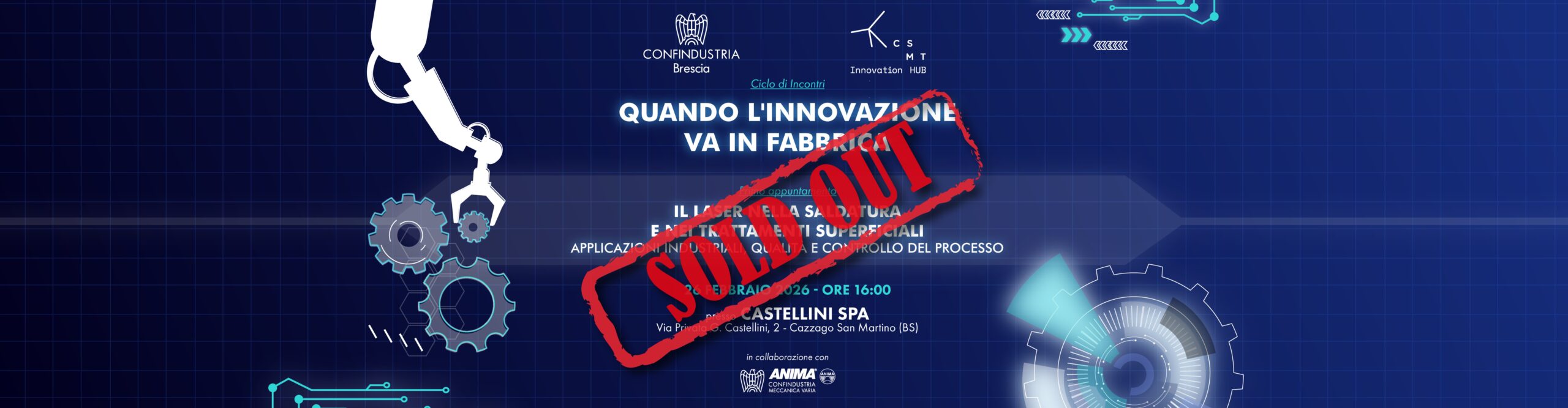 Il 26 febbraio 2026, dalle ore 14:30, presso la sede di  Castellini SpAvia Giuseppe Castellini 2, Cazzago San Martino (BS), si terrà il convegno “Il laser nella saldatura e nei trattamenti superficiali: applicazioni industriali, qualità e controllo del processo”. L’incontro inaugura il ciclo di appuntamenti “Quando l’Innovazione va in fabbrica”, promosso da Confindustria Brescia in collaborazione con CSMT Innovation Hub e ANIMA.