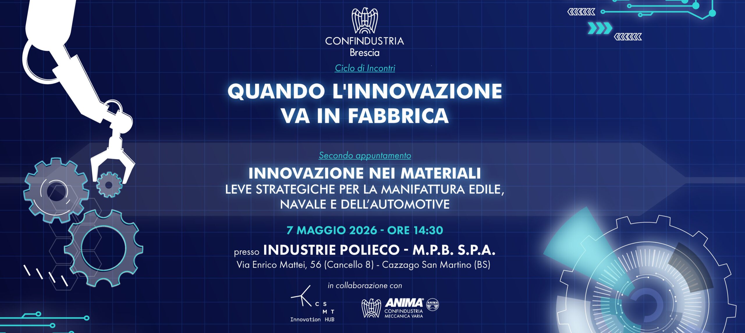 Il prossimo incontro, dal titolo “Innovazione nei materiali: leve strategiche per la manifattura edile, navale e dell’automotive”, si terrà il 7 maggio 2026, a partire dalle ore 14:30, presso Industrie POLIECO – M.P.B. S.p.A., via Enrico Mattei 56, Cazzago San Martino (BS) (Cancello 8), con la visita dell’azienda.