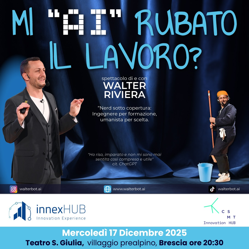 Il 17 dicembre 2025 il Teatro Santa Giulia accoglie la tappa conclusiva del tour dedicato al rapporto tra persone, tecnologie intelligenti e futuro del lavoro. Sul palco Walter Riviera porta uno spettacolo che intreccia divulgazione, teatro e visione, con il patrocinio di innexHUB e CSMT Innovation Hub.