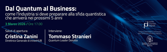 Il 3 marzo 2026, innexHUB propone il webinar Dal Quantum al Business: come l’industria si deve preparare alla sfida quantistica che arriverà nei prossimi 5 anni. L’iniziativa è patrocinata e cofinanziata dalla Camera di Commercio di Brescia.