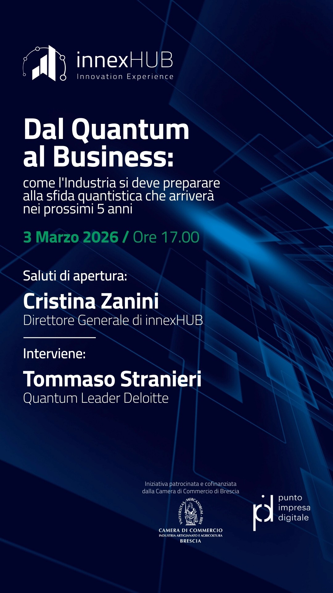 Il 3 marzo 2026, innexHUB propone il webinar Dal Quantum al Business: come l’industria si deve preparare alla sfida quantistica che arriverà nei prossimi 5 anni. L’iniziativa è patrocinata e cofinanziata dalla Camera di Commercio di Brescia.